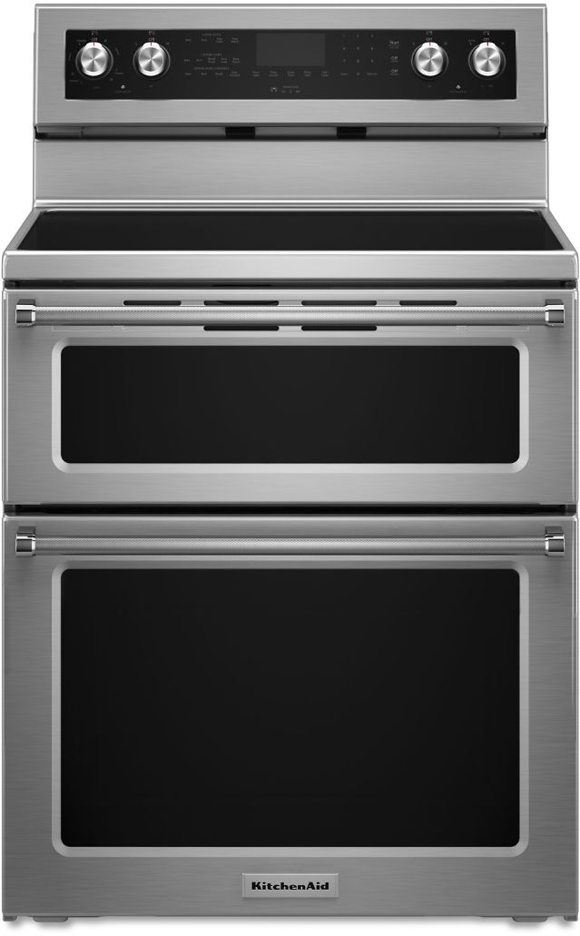 Combines a bold blend of professionally-inspired styling with sleek touches for the home. This double oven range features Satin Textured Handles and the KitchenAid® Badge, a symbol of uncompromised quality.
